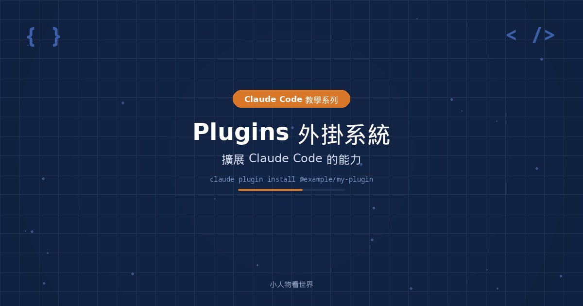 Claude Code Plugins 是一套標準化的擴充套件系統,讓你可以將自訂功能打包成獨立的模組,方便跨專案使用和與團隊分享。每個 Plugin 本質上就是一個包含 .claude-plugin/plugin.json 設定檔的資料夾,裡面可以放入 Skills、Agents、Hooks、MCP Server 等各種元件。